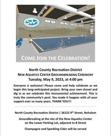 Ground Breaking for NCRD Pool Posted on May 8, 2023May 8, 2023 by North Coast BBQ Submitted By: Kileyk@ncrdnehalem.org – Click to email about this post Come one Come all… Join us Tuesday May 9 at 4:00 pm for the ground breaking of the Nehalem Pool.