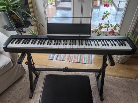 A great keyboard with the best polyphonics and lots of key features. Upgraded pedal for better action and a portable stand for gigs or easy storage. Comes with padded bench with adjustable height capabilities for proper back positioning.