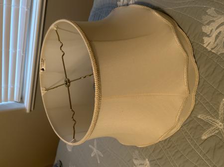 Gently used lamp shade. Very nice condition, no tears or stains. Cream colored with braided top and bottom rim. Measures 13” across top, 19” at base, and 11-1/2” heights. Asking $80. Please call or text 503-351-8383.