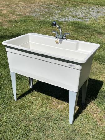 King sized, 24″ x 24″ x 16″, single bowl multi-purpose floor sink that’s great for washing dogs, BBQ grates, or soaking sporting goods. 1-piece molded tub of impact resistant polypropylene with heavy gauge steel legs. Comes with swivel faucet with 24″ pull-out spout and lever handles, 1-1/2″ P-Trap with 12″ tailpiece, 2, 20″ flexible braided supply lines, drain stopper, and large self-draining back shelf directs water run-off into the tub. Mold and mildew resistant components. Easy-to-assemble and install. Color-fast, stain resistant white finish.