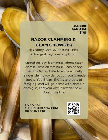 After clamming we will venture to Osprey Cafe where owner and avid forager, Josh Bokish will make us his locally famous smoked razor clam chowder. Josh opened Osprey Café in 2014 after working in kitchens all over Portland. The café focuses on brunch favorites, with an international flair and a specialty in local produce and seafood. Foraged goods often appear on the menu; including mushrooms, sea beans, stinging nettles, seaweed, fiddlehead ferns and wild onions, to name a few. Josh is also an avid fisherman, crabber, barnacle gatherer and clam digger in his spare time.