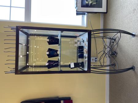 This artistic Cabinet has been created by Portland Metal Sculptor Ivan McClean. It is glass framed in metal with side glass sliding door access. Stands 72.5” high. The box is 39” tall X 24” X 24”. $250
