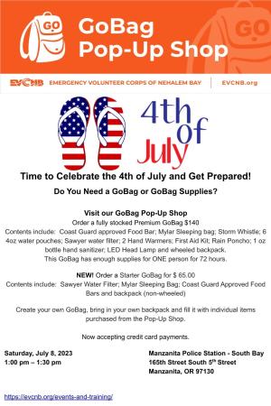 REMINDER: GoBag Pop-Up Shop, Saturday, July 08, 1:00 pm – 1:30 pm, Manzanita Police Station