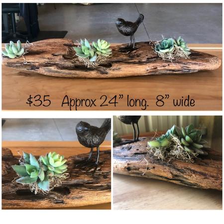 Beautiful Driftwood pieces with artificial succulents! Each piece has been fully cleaned, sanded and preserved. These pieces would make a great gift for any occasion. Please email me with any questions or to schedule a time to come see these beautiful pieces and others I have!