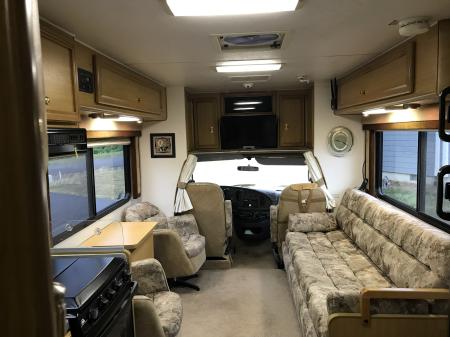 The Ford E-450 chassis is powered by the optional 6.8L V-10 gas engine with a K&N Air Filter system. The original engine, overdrive transmission (with the tow/haul option) and drive train have been regularly maintained with service records available. The towing capacity is 5000 pounds.