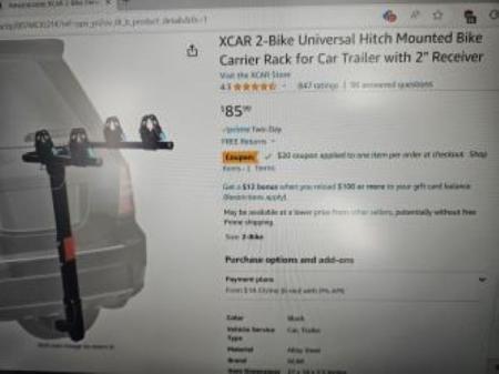 Bike Rack, 2 inch hitch receiver style, carries two straight frame bicycles. Does not work with step through bikes with out a bike extension bar. We unboxed it and assembled it last week, never on a hitch. $40