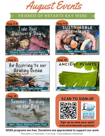 Friends of Netarts Bay Watershed, Estuary, Beach, and Sea (WEBS) has more fun and educational events planned for this August.