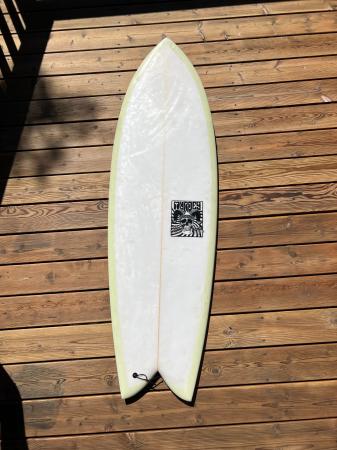 5’8″ x 21″ x 2 3/8″ Murdey fish surfboard.