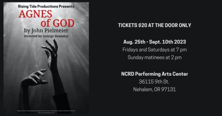 Agnes of God opens Friday, August 25th at NCRD Performing Arts Center. A special talkback presentation with the cast and director will be held after the matinee on the 27th. Tickets are $20 at the door. Doors open a half hour before curtain time.