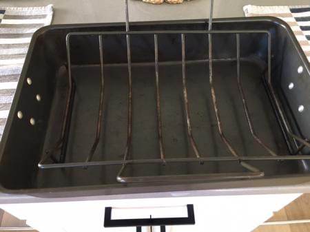 12 1/2″ wide, 181/2″ long. Big enough for that big prime rib, or that big turkey, or many racks of ribs. This roasting pan will last for generations with proper use. Discounted price is $60.00.