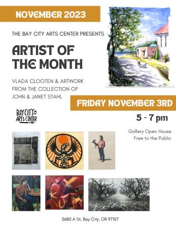 Friday November 3rd from 5 – 7pm at the Bay City Arts Center, November Artist of the Month upstairs gallery will feature work by local watercolor artist, Vlada Clooten. The main floor gallery will feature a diverse range of artwork from the collection of John and Janet Stahl. This monthly event is free and open to the public.