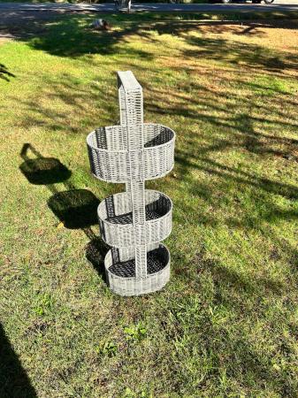 I have a wood wine rack with 4 drawers. Could use some oil or pledge. The three tier organizer, I don’t think it is real wicker but the plastic kind so should last much longer.