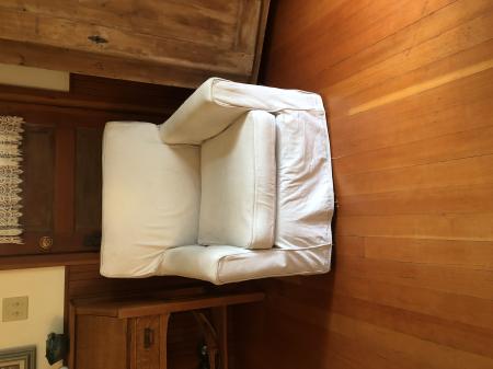 Our slip covered chair and old Pottery Barn slipcovers for the sofa shown need new homes. The slip covered chair is free and the sofa slipcover is $30. Slipcover need some minor sewing on a couple of seams and the right arm but, otherwise is pretty good shape. The chair under the slip cover looks like someone’s upholstery class project, but usable and comfortable with slipcover. Buyer must pick up at our house in Wheeler. Contact number 503-440-6309.