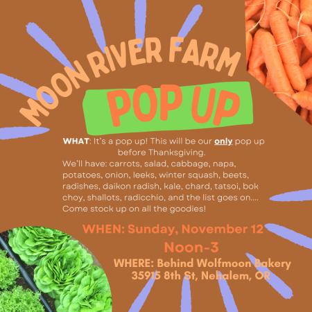 It is Pop Up season! Moon River Farm is having a veggie pop up sale in the covered space behind Wolfmoon Bakery.