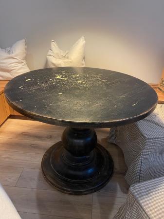 Pottery Barn Rustic Round Table. Solid wood 40″ diameter, 30.5″ tall. Wonderful table for a dining nook.