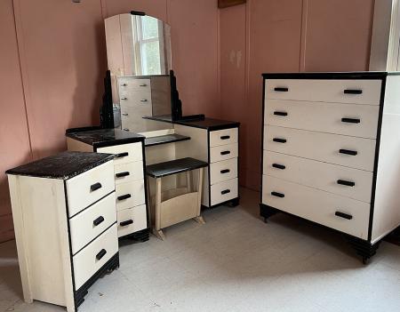 Great vintage bedroom set includes vanity with mirror and stool, tall dresser and night stand. Good condition. Vanity is missing left rear leg.