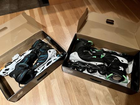 Includes safety equipment, elbow and knee pads and wrist guards.