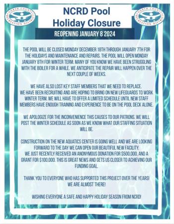 NCRD Winter Pool Closure Posted on December 18, 2023December 18, 2023 by North Coast BBQ Submitted By: kileyk@ncrdnehalem.org – Click to email about this post Please note that the NCRD Pool will be closed for winter maintenance and boiler repairs.