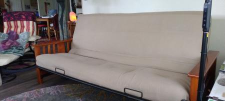 Double bed sized mattress, black metal frame and wood arm rests. Has good innerspring mattress, very comfortable for sleeping. All in very good condition.