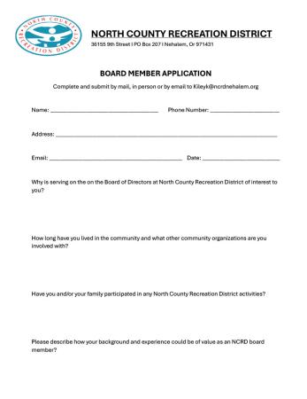 North County Recreation District (NCRD) currently has a Board Vacancy. Position #5 will be appointed by the current Board of Directors and expires on 6/30/25. Anyone interested in this Board position should submit a Board Member Application and resume or letter of qualifications to: