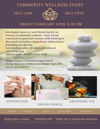Please join Megan Lucas LAc and Certified Sound Healer Christy Kay for a special February Self Care/Self Love Community Wellness Event at Rising Hearts Studio, Friday February 16th, 6:30 PM – enjoy community acupuncture, while bathing in the sounds of healing singing bowls, with grounding tea offering to follow. Leave feeling calm, refreshed and renewed.