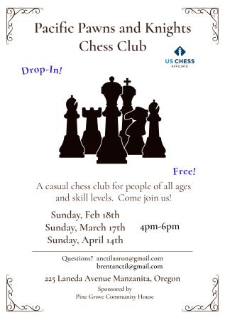 Pacific Pawns and Knights Chess Club Meets Tomorrow! Posted on February 17, 2024February 17, 2024 by North Coast BBQ Submitted By: lesleyanctil@gmail.com – Click to email about this post Chess Club Tomorrow 4-6, Pine Grove. All ages and experience levels welcome. Come play chess!