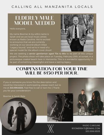 We are seeking a senior gentleman aged 70s to 80s to be part of this unique project. The shoot will take place on Tuesday, February 20th, at sunset, in a picturesque coastal beach here in Manzanita. This is a wonderful opportunity to be part of something meaningful and leave a lasting legacy.