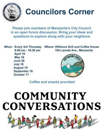 Please join members of Manzanita’s City Council in an open forum discussion every 3rd Thursday at the Offshore Grill.