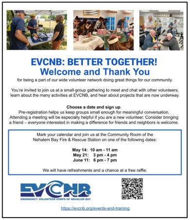 EVCNB Volunteers and those who want to join our network are invited to attend one of three informational get-togethers offered on the dates below.
