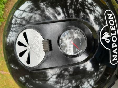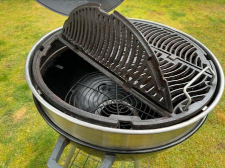 cooking grids for those distinctive sear marks. Easy access, hinged, porcelainized cast iron cooking grids make adding more charcoal or woodchips effortless, while three cooking heights and masterful airflow management provide precise temperature control. The improved PRO Air Control system increases air and temperature accuracy. A large stainless steel heat diffuser lifts the charcoal up off the bowl of the kettle evenly radiating heat throughout the grill and directing spent charcoal down to the ash catcher. On the outside, this grill shines. The powder-coated steel body shrugs off the elements. The lid features an offset hinge that opens, allowing access to the whole cooking surface while keeping your hands away from the heat.