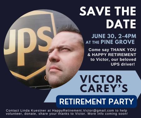 Come say THANK YOU and HAPPY RETIREMENT to Victor, our beloved UPS Driver! Stop in between 2-4 to wish Victor well! Cake and toast at 3pm. RSVP at our FaceBook event: fb.me/e/8VvsqOT3R