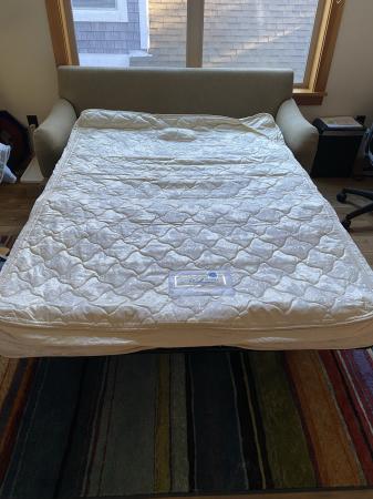 Sleeper sofa with full size air over coil mattress. Hand made in the US. Very comfortable and extremely well made.