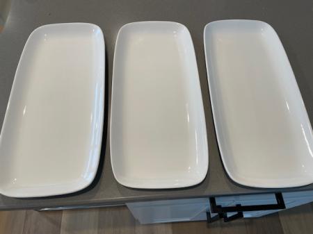 White ceramic family style/ buffet plates. These work great for gatherings, and they don’t take up a lot of space on the counter/table. Measures 7 1/2″ wide and 16″ long. They are in excellent condition, dishwasher safe. All for $25.00, can be picked up in Manzanita, cash only please.