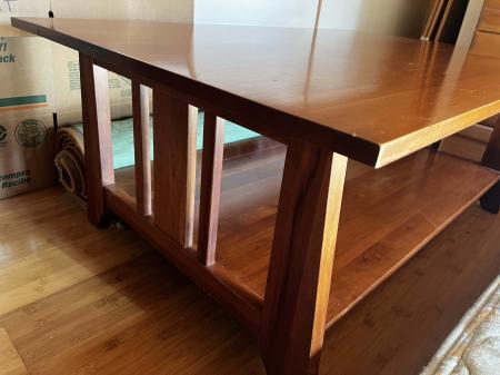 Mission style coffee table with shelf in good condition. Has some scratches (see pic for the worst one.) It’s fairly heavy and solid. May be Ethan Allen?