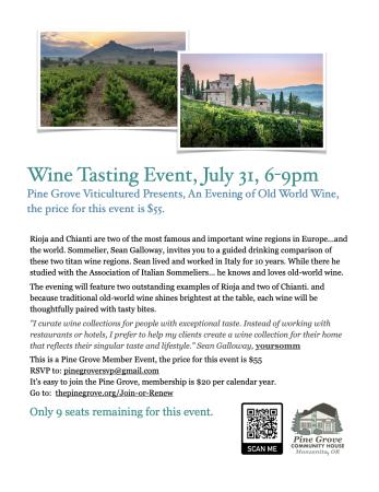 Wine Tasting Event, July 31, 6-9pm Pine Grove Viticultured Presents, An Evening of Old World Wine,