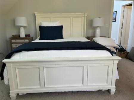 Wooden white queen size bed frame – Headboard – 61.5” high, 66” wide. Footboard – 67.5” wide, 25.5” high – $125.00.
