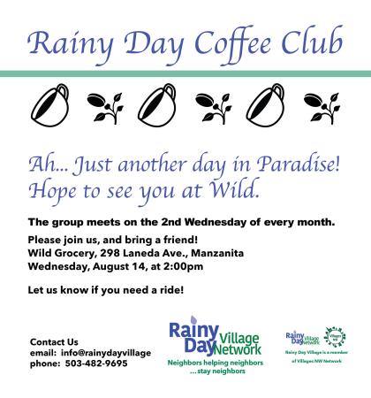 Rainy Day Coffee Club on Weds, 2pm @ Wild Posted on August 13, 2024August 13, 2024 by North Coast BBQ Submitted By: info@rainydayvillage.org – Click to email about this post Rainy Day Coffee Club on Wednesday, Aug 14, 2pm at Wild.