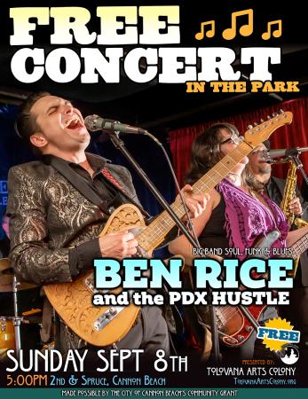 Ben Rice & The PDX Hustle present a free concert in Cannon Beach’s downtown city park, at 5:00PM on Sunday, September 8th.
