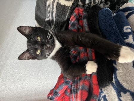 Eli greets new people with no fear, immediately in his friendly mode! He likes to “hunt” mice on a stick and springs like a panther when he chases them. Gets along great with other cats and would probably do well with friendly dogs and older children.