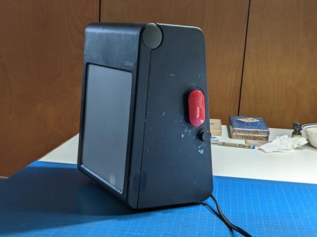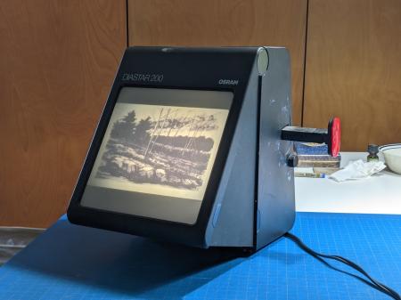 Takes a stack of photo slides and feeds them through the viewer one at a time. Good condition, just a little paint on the outside.