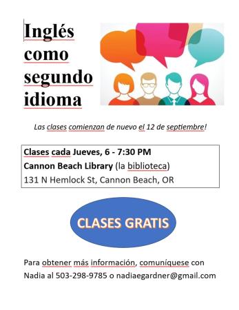 Las clases gratuitas de ESL comienzan esta tarde en la biblioteca, todos los jueves de 6 a 7:30, para todos los niveles, sin inscripción, ¡solo preséntese!