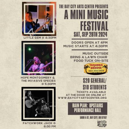 Join us for a Mini Music Festival presented by the Bay City Arts Center on Saturday, September 28th, 2024! The special event starts at 4pm with music starting at 4:30 PM with three diverse musical acts, all performing outdoors—so bring a lawn chair and enjoy the tunes in the open air. Enjoy food on-site from Tillamooks’ local food truck, Taqueria Mendez. Weather permitting, the festival will move indoors to the upstairs performance hall.