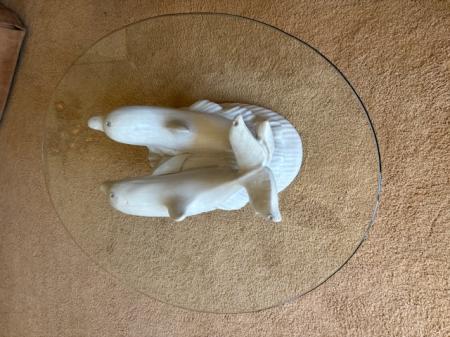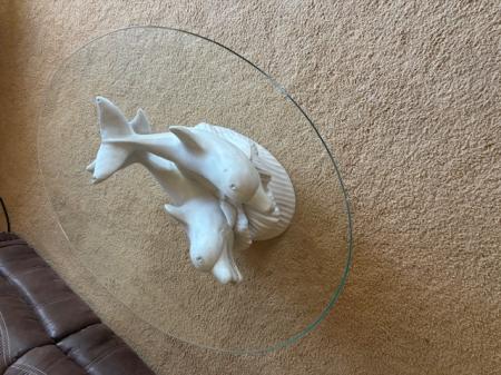 Like new coffee table with sculptured dolphin base and oval glass top.