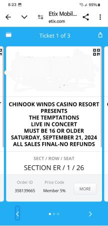 All guests are allowed to enjoy our concerts by sitting in or standing in front of their own ticketed seat. Please be respectful and courteous to your fellow concert-goers.All guests are allowed to enjoy our concerts by sitting in or standing in front of their own ticketed seat. Please be respectful and courteous to your fellow concert-goers.Posted are the tickets minus the bar scans and ticket numbers. Once a confirmation on the tickets are recieved the tickets can be emailed or physically picked up.