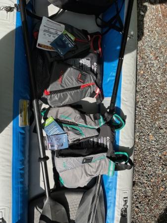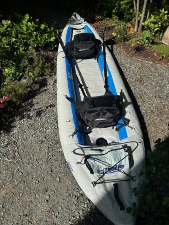 This is an amazing kayak I got my husband for his birthday and has used once! 🙂 It was perfect size for the two of us and our spaniel, unfortunately our spaniel wanted to swim more than kayak.