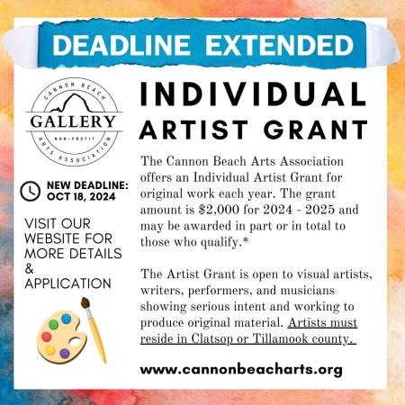 The Cannon Beach Arts Association is extending the Individual Artist Grant deadline until Oct 18th, 2025.