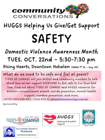 TIDES OF CHANGE will join HUGGS(Helping us Give/Get Support), and community members to talk about how we can support EVERYONE to feel safe to live their best lives. Find out about TIDES OF CHANGE and HUGGS resources for domestic violence/sexual assault, suicide prevention, mental health support, overdose prevention, and more.
