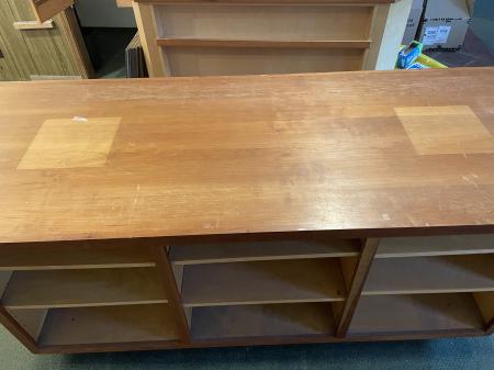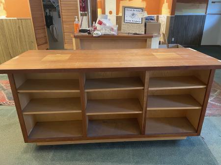 Perfect for a studio or shop, this beautiful table was built by a local craftsman and has lived in the bookstore for the past twenty years. The wood is lovely, the construction is solid and aesthetically pleasing, and there is ample storage. The top has two discolored squares where display pillars once stood (they now live in the window of the new store), but would easily be brought back to the original color. I am asking for $200, which will help cover costs of the bookstore move.