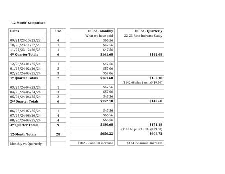 After the initial three months (a “quarter” period from 9/21/23 to 12/26/2023) with the new “monthly” reading and billing schedule, it became evident that a simple change from quarterly to monthly would variably result in higher fees.