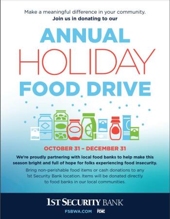 1st Security Bank has started our annual food drive. Going on now through 12-31-2024. Donations can be made at any branch location!!! All items and funds remain in our local communities.